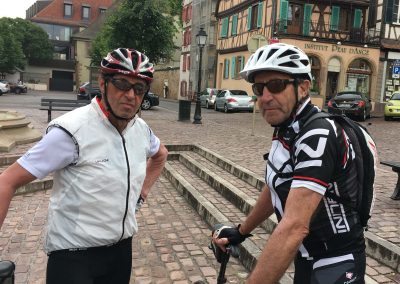 Tag 2 begann mit ein paar Regentropfen, die sich jedoch im Laufe des Tages zurück hielten. Wir radelten über schöne Radrouten nach Colmar, weiter in die Ausläufer der Vogesen, entlang der Weinstraße nach Riquewihr mit Einkehr. Wieder zurück zum Rhein mit einer langen flachen Rückfahrt.
