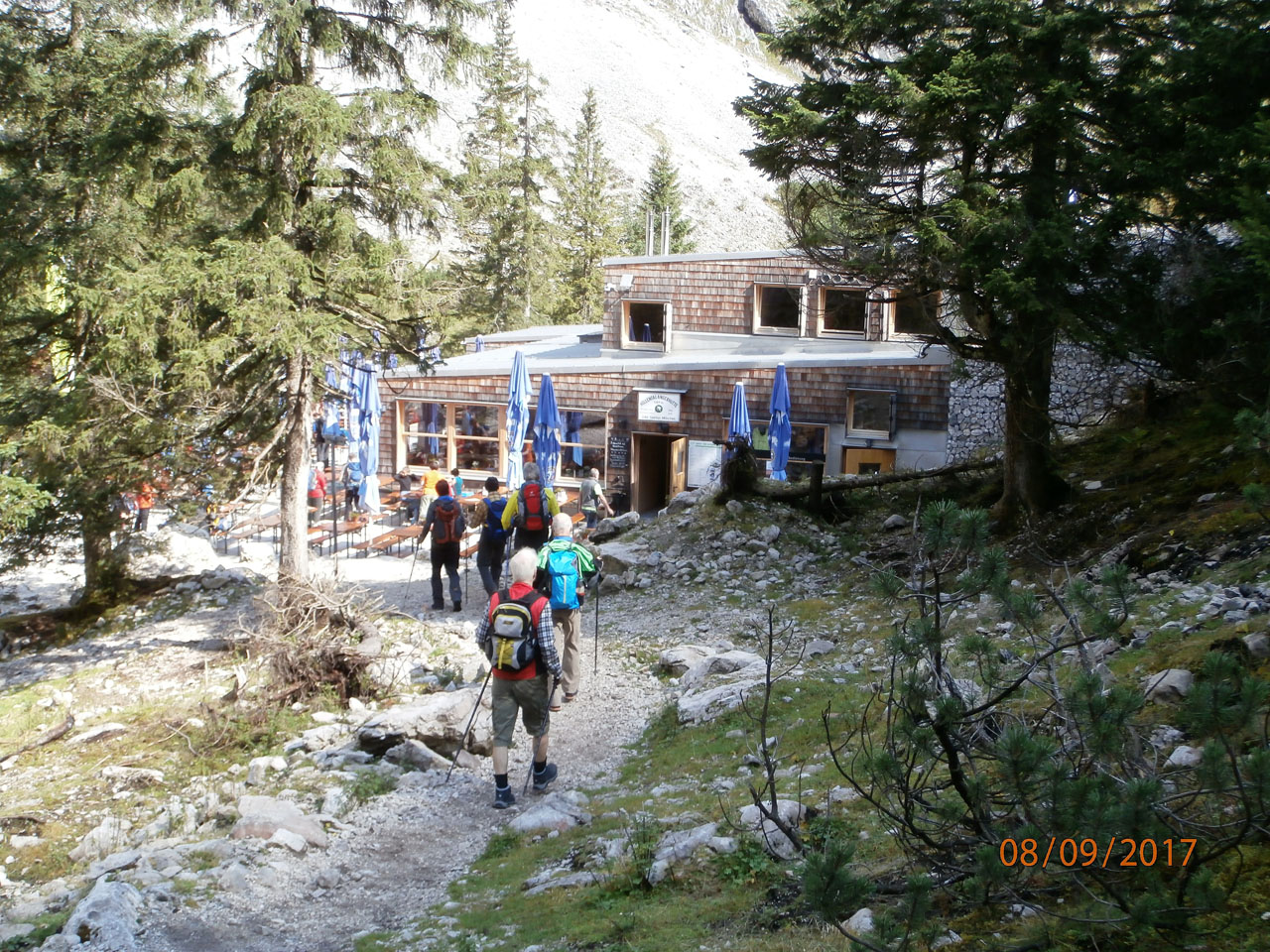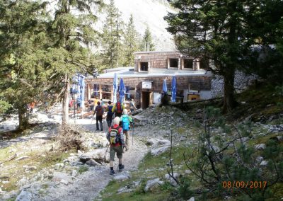 wunderschöne Aussichten in das Wettersteingebirge. Von dort ging es bergab auf engem Steig über die Knappenhäuser zur Höllentalangerhütte, eine Einkehr war hier angesagt. Der Blick zur Zugspitze hat uns alle sehr beeindruckt. Nach der Stärkung machten wir uns auf den weiteren Abstieg durch das Höllental und die Höllentalklamm. Der Weg durch die Klamm ist etwas feucht aber gigantisch. Nach dem Verlassen der Klamm traten wir den restlichen Weg über Hammersbach zum Ausgangspunkt an der Kreuzeckbahn an. Den Abschluß dieser nicht allzuschweren Tour biIdete dann eine Einkehr in die Gaststätte „Jägerhaus“ bei Bad Kohlgrub. Unter der Abendsonne wurde im Biergarten bei einem guten Essen der Tag nochmals besprochen. Es war ein sehr schöner Tag mit herrlichen Ausblicken in der heimischen Bergwelt.
